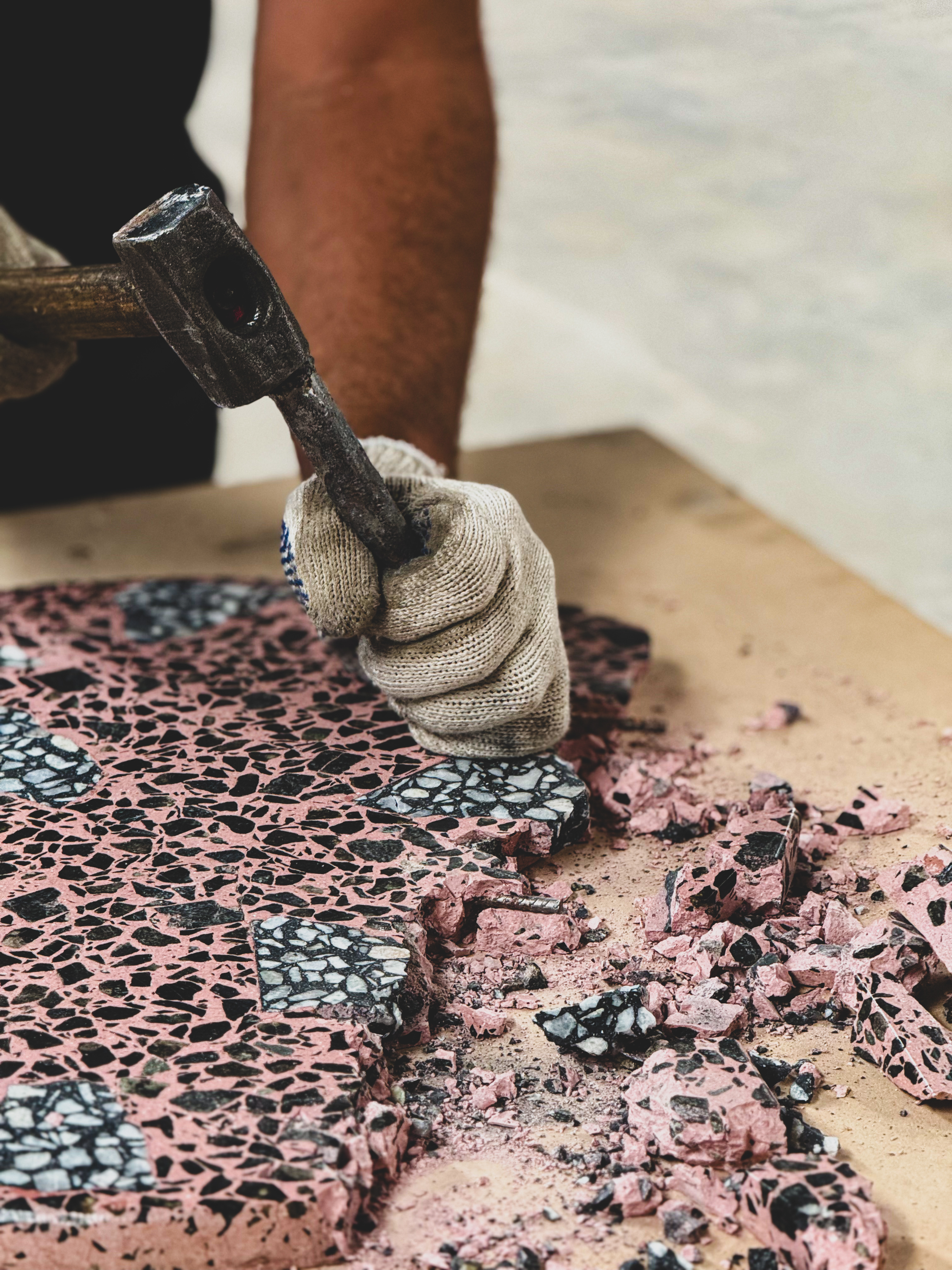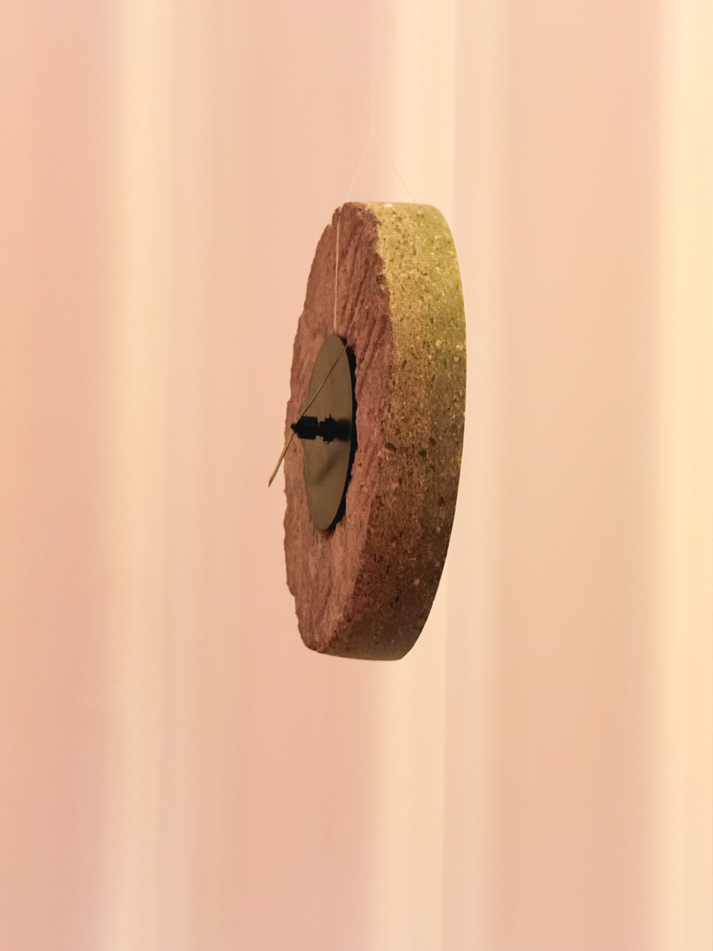 Reloj de terrazzo pulido y brillante. Finalmente, el reloj alcanza un balance entre el contenido y el contenedor, simbolizando la tranquilidad y el equilibrio interior.